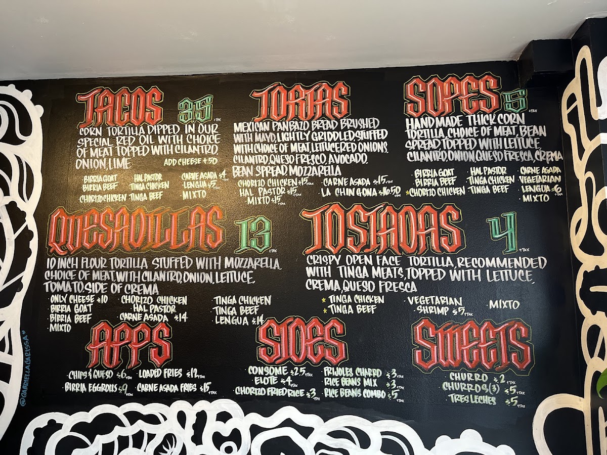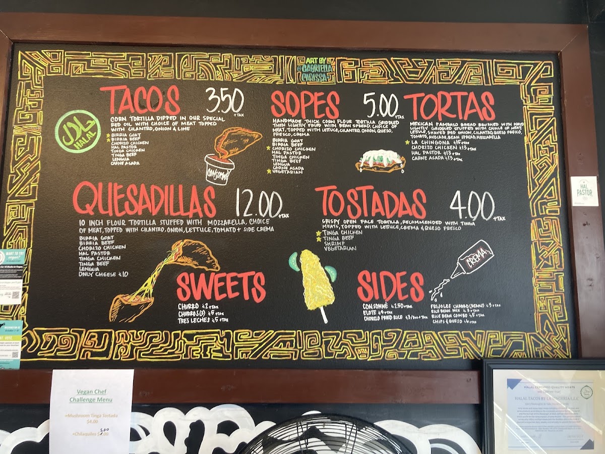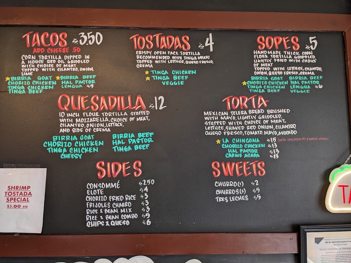 La Tingeria’s menu offers a straightforward and inviting selection of Mexican and Latin American dishes that emphasize fresh, flavorful ingredients and halal preparation. The menu strikes a balance between casual, satisfying bites like tacos, quesadillas, and tostadas, and more hearty options such as tortas and traditional plates, making it suitable for a quick lunch or a relaxed evening meal.